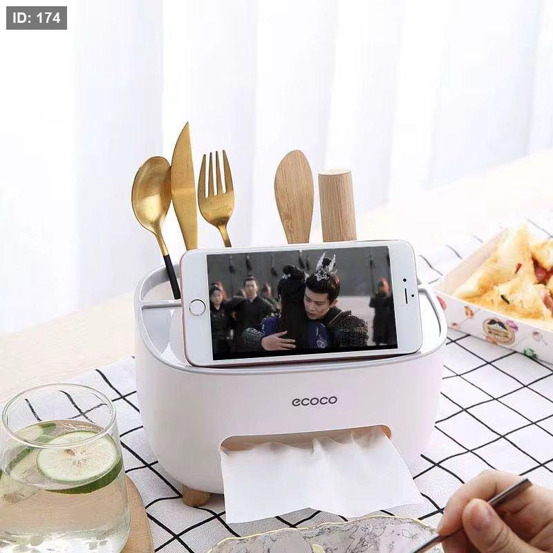 - على طاولة الطعام: كحامل للمناديل وأدوات المائدة مع إمكانية مشاهدة الهاتف.