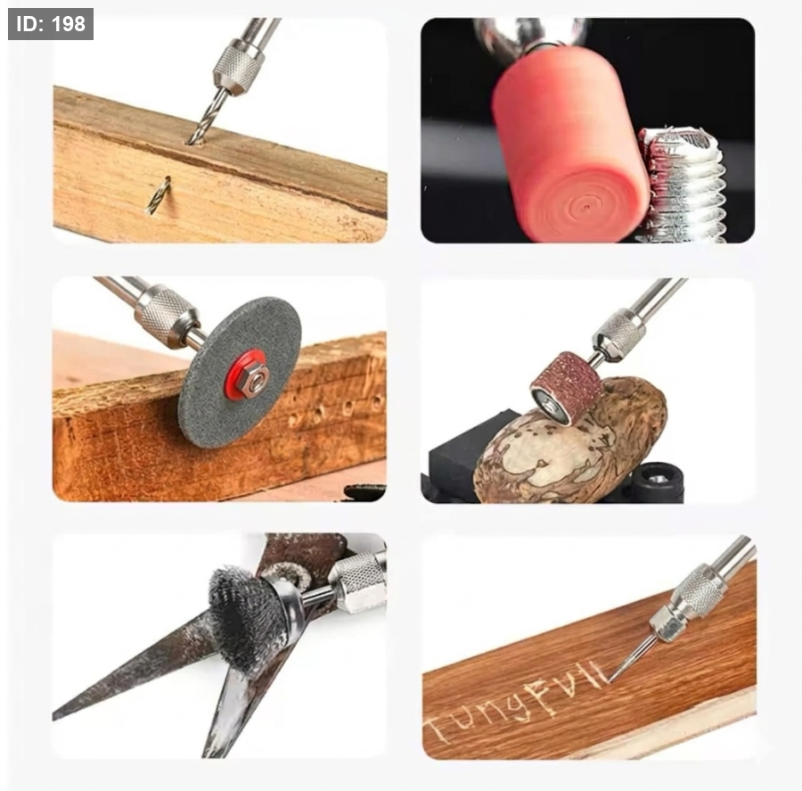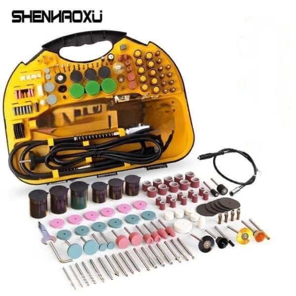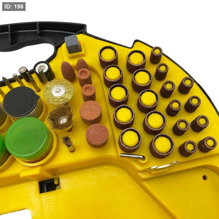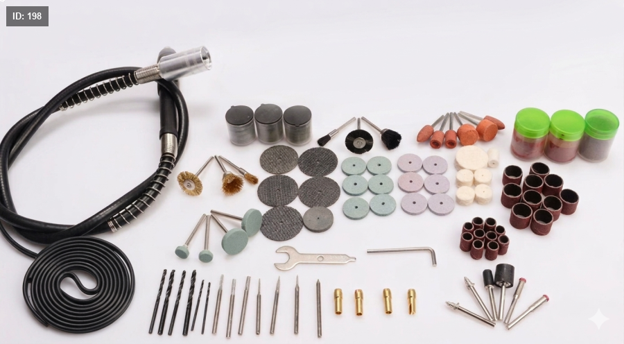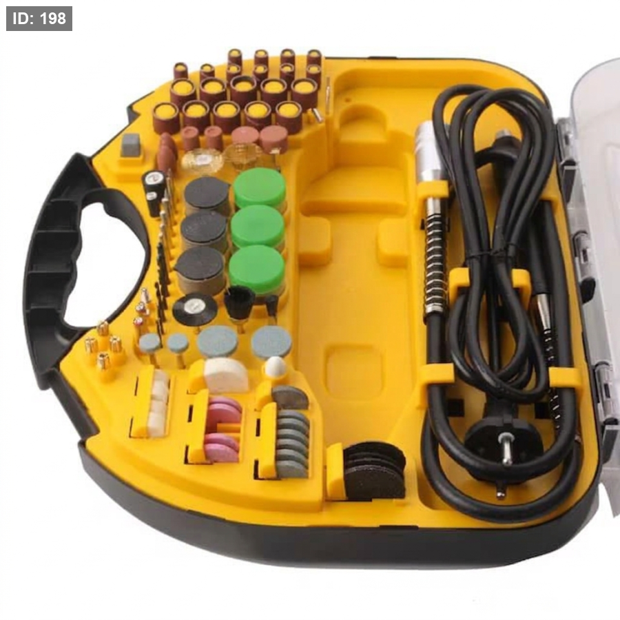 - يحتوي على أكثر من 100 قطعة متنوعة (حفر، نحت، صنفرة، تلميع، قص) لتغطية كل احتياجاتك على الخشب، المعدن، الزجاج، والبلاستيك.