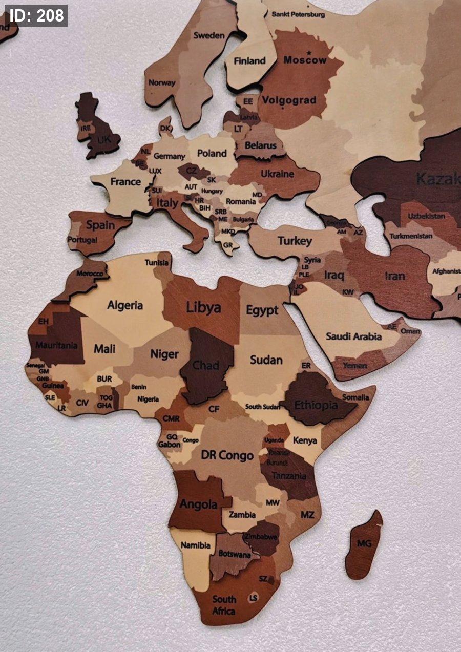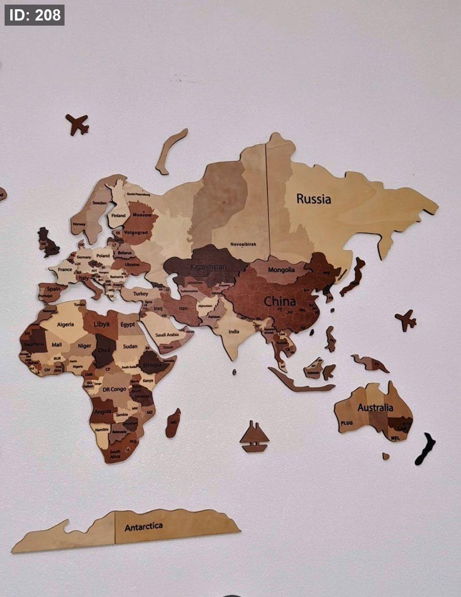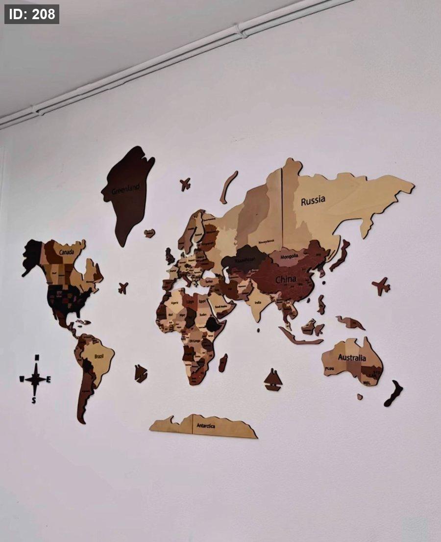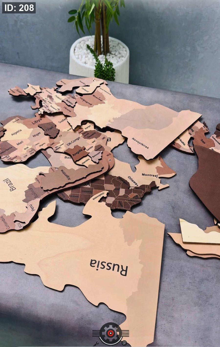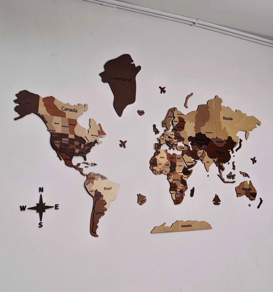 - تصميم ثلاثي الأبعاد: تتميز الخريطة بطبقات خشبية متعددة الارتفاعات والألوان، مما يعطي عمقاً بصرياً مذهلاً وتأثيراً واقعياً على الحائط.